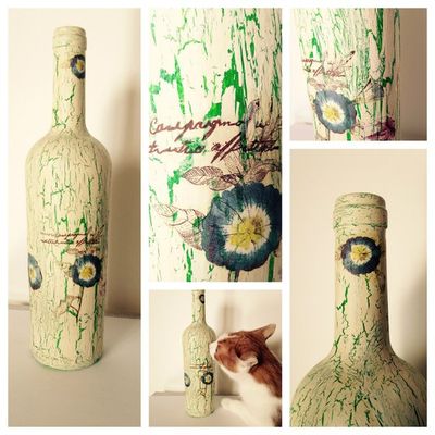 Декоративная бутыль "Старый Прованс". Материалы: - акриловый грунт; - декупажная карта; - кракелюрный лак; - акриловые краски; - акриловый лак.