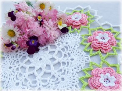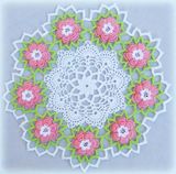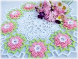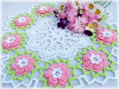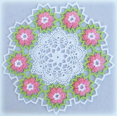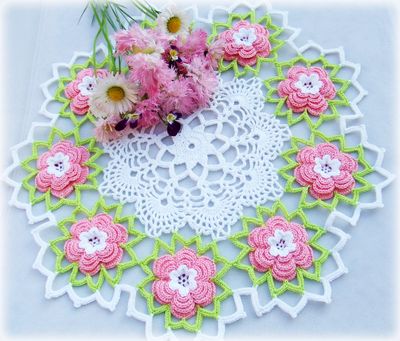 Салфетка связана крючком из 100% мерсеризованного хлопка. По краям розовые объемные цветы. Смотрится очень нежно. Украсит любой интерьер. Возможно исполнение в другом цвете. Диаметр ~ 28см