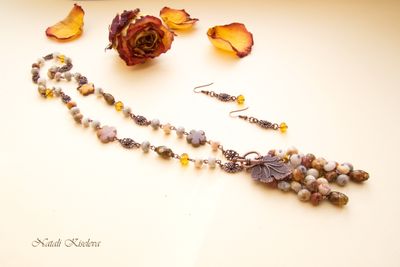 Комплект колье и серьги. длинное колье с красивой застёжкой с переди в виде виноградного листа которая соединяет две виноградные грозди. Очень красиво смотрятся бусины из яшмы в виде цветков.