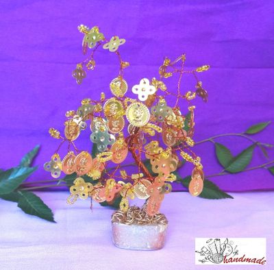 Денежное дерево создано руками Юлии. Материал - бисер, металлические золотистые пластинки, проволока гипс. Основания разной формы и размеров.
