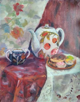Размер: 40х50см Материалы: холст на подрамнике, масляные краски. Натюрморт в тёплой гамме, на тему чаепития, прекрасно подойдёт на кухню или столовую, кружевная салфеточка и большой пузатый найник навевает воспоминание о деревне, где добрая бабушка нальёт нам вкусный малиновый чай.