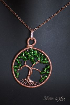 Кулон из медной проволоки и чешского бисера. Такое украшение очень красиво будет смотреться как с черной, так и со светлой одеждой. Зеленый бисер красиво блестит, когда на него падает свет.