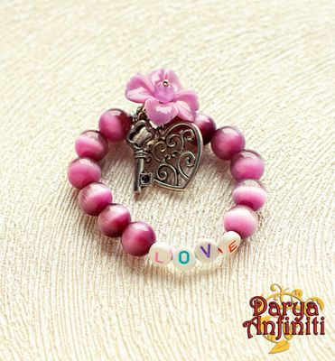 Детский браслет со словом LOVE и подвесками цветок, ключ, сердце. Камни: кошачий глаз имитация