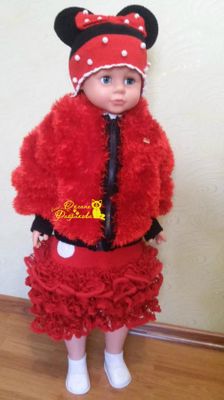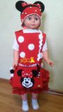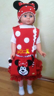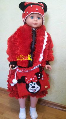 Предстваляю комплект Минни маус для девочки ! В комплект входит шапочка , курточка , сумочка и курточка .На девочку от 1 до 3 лет . Сумочка 23 на 17 см. декорирована аппликацыей минни маус девочки с бантиком .Платье длиной 52 см. на обхват попы 70 см.