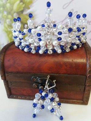 Диадема из стекляных бусин под жемчуг, прозрачных хрустальных бусин, страз в цапах. К набору идут серьги в аналогичном исполнении. Диадема и серьги продаются также отдельно. Возможно исполнение в другом цвете и из более дорогих материалов.