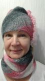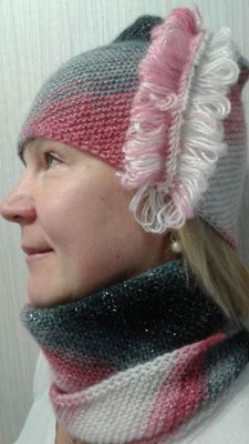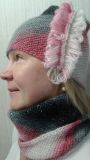 Набор"диагональ"состоит из шапочки и снуда,связан из мохера,пр-ва Турция,с боку шапочки связан мех-аппликация,набор подходит для осени.