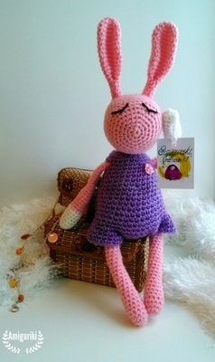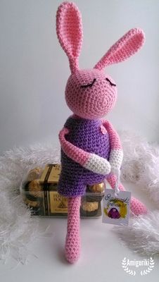 Игрушка амигуруми длинноухий зайчик. Высота игрушки вместе с ушками 35 см. Состав: 100% акрил. Наполнитель: синтепон. Связано в фиолетовом, розовом и белом цветах. Цветовая гамма и фурнитура по желанию заказчика. Имеется в наличии.