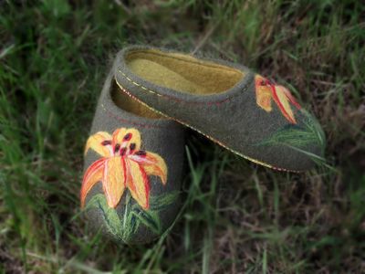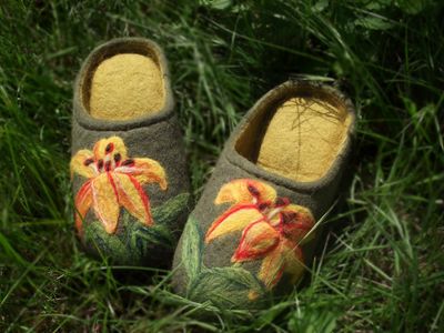 Домашние тапочки из 100% шерсти,подошва из микропористой резины,прошита и проклеена.Размер 36-37.Под заказ можно другой размер и цвет.Срок изготовления две недели.