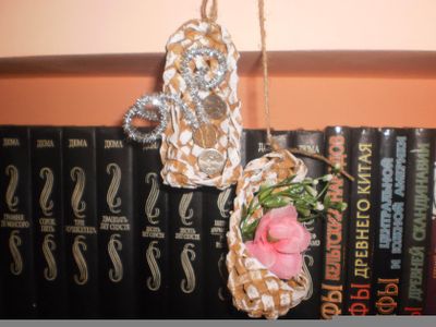 Пара лаптей приютят вашего домовога и принесут уют и достаток. Материал: бумажная лоза, искуственные цветы, монеты