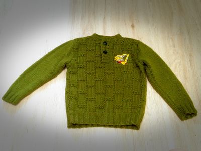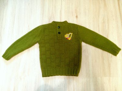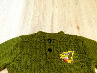 Джемпер с застежкой поло "Экскаватор" цвета хаки и украшен маленькой аппликацией . Размер 98-104 (3-4 года) Состав: 49 % шерсть, 51 % акрил Джемпер теплый, не подойдет для очень чувствительной и нежной кожи.