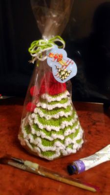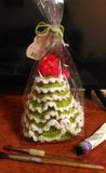 ручная работа, авторская, повторение точное- невозможно, вязанная елочка, пряжа- шерсть, ц вет ярко салатовый с серебристыми нитями, украшена пумпоном, высота 22 см, устойчивая