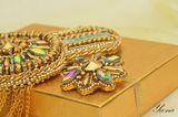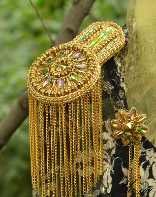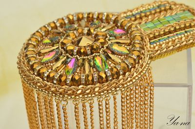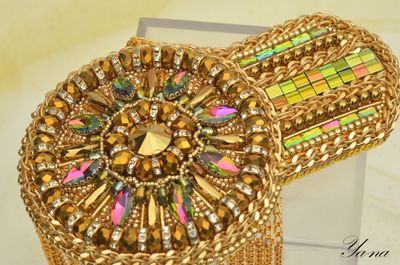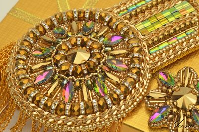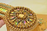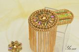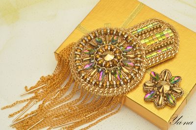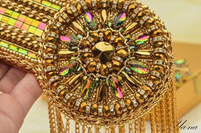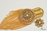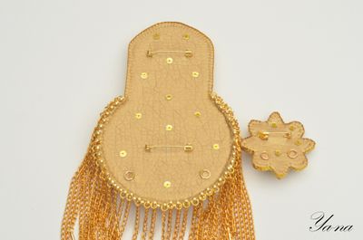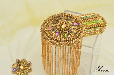 Роскошный блестящий золотой эполет со стразами, цепями "Сияющее солнце" выделит вас из общей массы. Завистливые взгляды женщин и восторженные мужчин вам обеспечены! На солнце и при искусственном свете горит и играет всеми лучами радуги. Вышит японским элитным бисером, хрустальными стразами в кружевной оправе, канителью, цепями, хрустальными и металлизированными бусинами. На изнанке стоит искусственная кожа с перламутровым золотым покрытием. Застежки-японские булавки, которые не оставляют следов на одежде. Только в единственном экземпляре! Повторы делаю, но вношу существенные изменения и от оригинала мало что остается. Можно носить на левом или правом плече. Такие погончики великолепно смотрятся на нарядах с закрытой горловиной и облегающим плечом. Бисер, стразы и цепи имеют свой вес, поэтому на свободном наряде из легкой ткани возможен перекос плеча. На курточках, плащах, шубках, пиджаках из плотных тканей сядет идеально. Если нужна консультация по подбору эполетов и нарядов, пишите в личные сообщения, проконсультирую с удовольствием! Доставка по России бесплатно! Материалы: Японский бисер, стразы, канитель, цепи, японская булавка, искусственная кожа, металлофурнитура, чешские бусины, металлизированные бусины, подвески южнокорейские Размер: Эполет: 13,5 см в длину, 9 см в диаметре, в узкой части 5,5 см, бахрома-11 см в длину; Аксельбант: 5 см в диаметре; Навеска 10 см в длину; Цепь 47 см;
