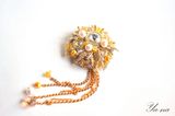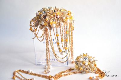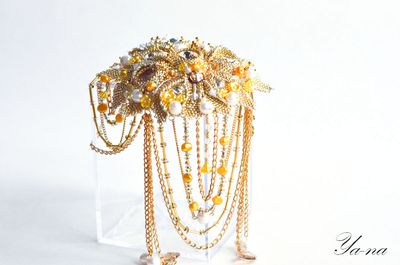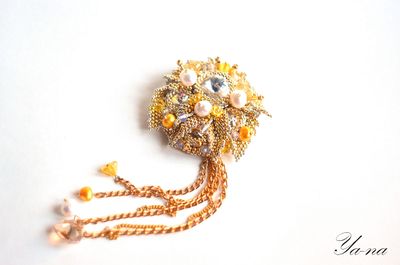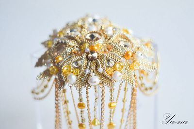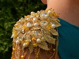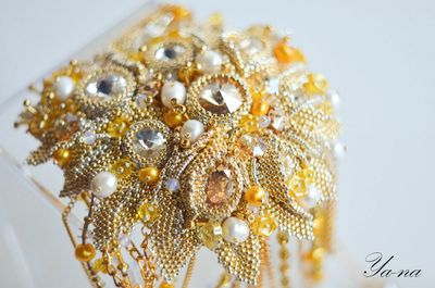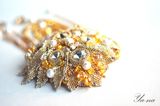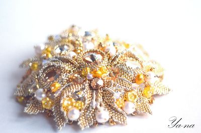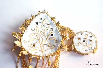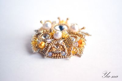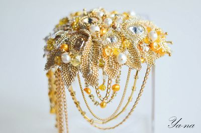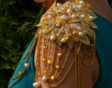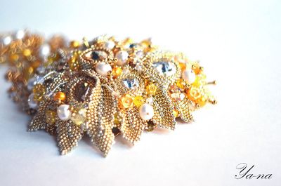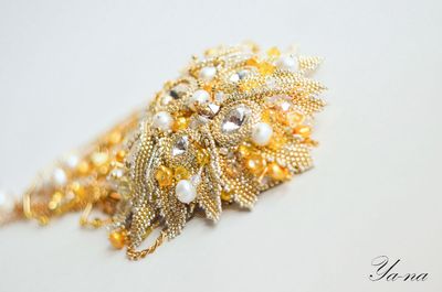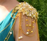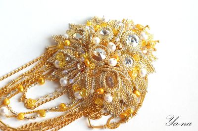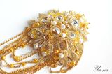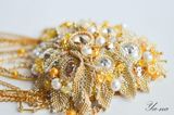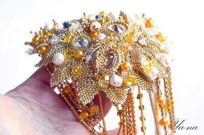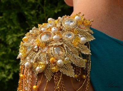 Гламурный объемный эполет-погон из бисера, жемчуга, ювелирных камней Сваровски украсит ваш вечерний наряд и внесет неповторимую нотку изюминки в ваш образ. Эполет на одно плечо с аксельбантом и отстегивающимися цепочками. Точного повтора не будет!!! Станет прекрасным и запоминающимся подарком на любой случай для девушки или женщины, желающей чувствовать себя неповторимой. Капли жемчужной росы на золотых листьях, вот что приходит на ум, когда смотришь на это украшение. При искусственном свете и на солнце Сваровски "горят" и искрятся на солнце, притягивая к себе взгляд. На эполете нашиты золотисто-серебристые листья, выполненные из высококачественного японского бисера. Использовался так же натуральный жемчуг белого и золотистого цвета, чешские бусины в виде колокольчиков, цветочков и ракушек. Бахрома сделана из нитей бисера, бусин и пайеток европейского качества стойкими к истиранию и заломам, а так же золотых цепочек разного размера. На изнанке стоит натуральная кожа, вышитая золотыми нитями и пайетками с рисунком в виде стебля с листьями. Обратите внимание! Такой эполет тяжелее, чем простые плоские погоны, поэтому наряд подбирать надо будет с закрытой горловиной, чтобы эполет не стащил наряд с плеча или не пошел перекос. Доставка по России входит в стоимость изделия!!! Материалы: Японский бисер, ювелирные камни Сваровски, стразы Сваровски, кристаллы сваровски, пресноводный жемчуг, бусины колокольчики, бусины цветочки, пайетки, кожа натуральная, цепи Размер: Эполет вдоль плеча 12 см, в ширину -11 см в самой широкой части. Бахрома по внешнему краю плеча 10 см, висюльки-13, с боков-7 см. Диаметр аксельбанта 5,5 см, кисть-12 см. © https://www.livemaster.ru/item/31199683-ukrasheniya-epolet-iz-bisera-zhemchuga-i-svarovski-zhemchuzhn