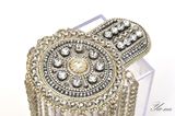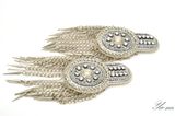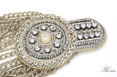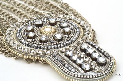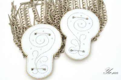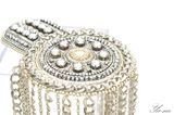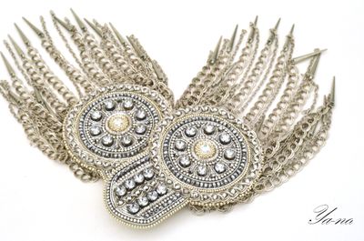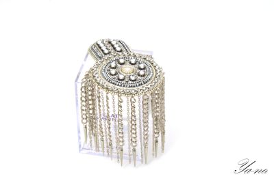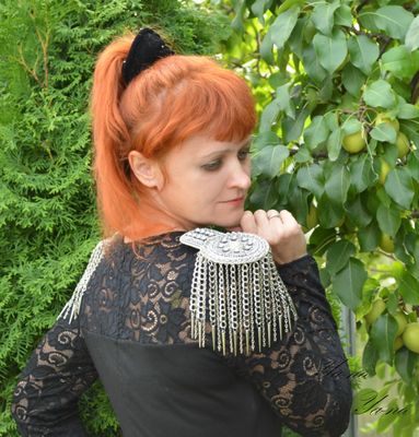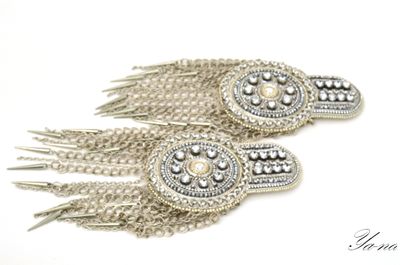 Шикарные декоративные эполеты в серебристом цвете с фигурными и стразовыми цепями, канителью, стразами и бисером украсят ваш наряд, сделают ваш образ неповторимым и гламурным. Подойдут для сценических костюмов. Нарядно будут смотреться на куртке или пальто. На концах цепочек подвески в виде металлических шипов. В центре стоят риволи Сваровски с напылением патины. На изнанке стоит натуральная кожа, вышитая серебряной нитью и пайетками. Замочки стоят японские, острые, которые не оставляют следов на одежде. На свету эполеты блестят и переливаются. Погоны идут парой. Не разбиваю этот комплект. Точного повтора не будет, вы будете единственной обладательницей такого аксессуара. Прошу обратить внимание, что обилие цепей и подвесок делает эполеты тяжелыми, поэтому не подойдут для наряда из легких тканей, с открытым декольте, широким рукавом в области плеча. По желанию можно переделать бахрому из цепей. Доставка по России включена в стоимость. Материалы: Японский бисер, стразы, стразовая цепь, канитель, риволи сваровски, цепи металлические, подвески шипы, бусины, кожа, японская булавка Размеры: В широкой части 9 см, в узкой-5,5 см, В длину 13 см. Длина бахромы 12 см
