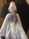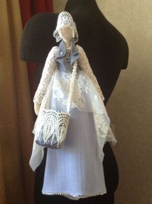 Кукла в стиле Тильда. Под юбочкой закрепляется туба с ватными дисками, а в сумочку помещаются ватные палочки. Удобно пользоваться и красиво хранятся столь необходимые в быту принадлежности.. Куколка подвешивается за петельку на любой крючок и служит украшением интерьера