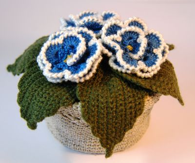 Выполнена крючком из акриловой пряжи, вазон из суровой нити.