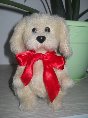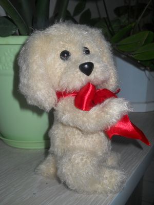 Филя - щенок побольше, уже примерно 20 см., связан крючком из ниток "Хлопок-травка", начесан до пушистости, глазки и нос пластиковые, стоит на задних лапах и попе, передние лапы и голова подвижны, на пуговичном креплении. Может служить не только игрушкой для ребенка, но и приятным сувениром для взрослого.
