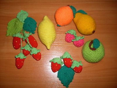 Ягоды- малина, клубника.Стоимость изготовления ягод - 100 рублей. Фрукты - яблоко, груша, апельсин, лимон. Стоимость изготовления фруктов - 200 рублей. Можно поместить в интерьерную корзинку, представленную в магазине.