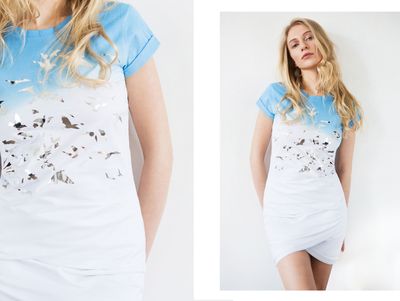XS, S, M Футболка по фигуре с манжетами, градиентом и серебряными птичками. (окрашена вручную) Состав: хлопок 100%