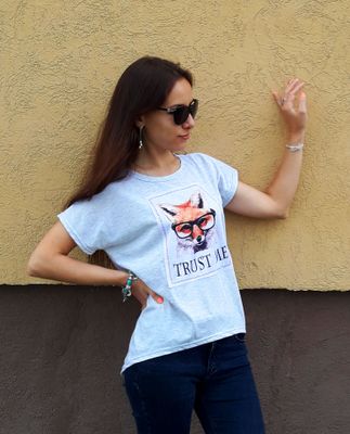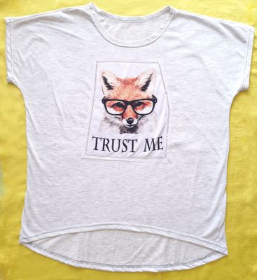 Футболка женская с дизайнерским принтом-нашивкой "лиса". Свободный крой. Ткань - светло-серый меланж. Состав: 80 % хлопок, 20 % эластан. Размер - 42.
