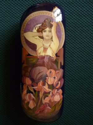 Выполнен в технике миниатюрной лаковой живописи, по литографии А. Мухи. 2015г. Масло, лак 15,5*6,5 см