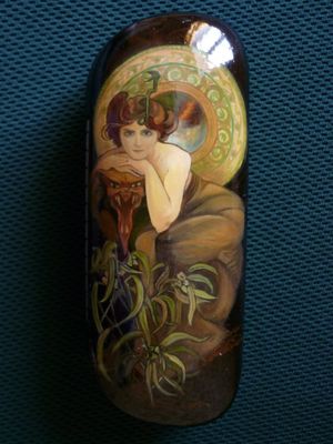 Выполнен в технике миниатюрной лаковой живописи, по литографии А. Мухи. 2015г. Масло, лак 15,5*6,5 см