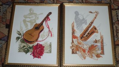 Две картины, вышиты в техниках крест и полукрест. Цена за одну - 6000. При покупке пары-11 000 цена за две. Могу вышить третью картину этой серии - Скрипка ( только при покупке трех).