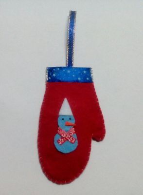 Новогодняя игрушка из фетра " Варежка " на ней снеговик тоже из фетра . Варежка украшена атласной лентой