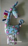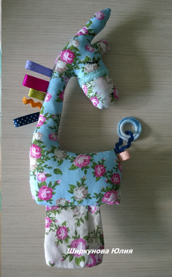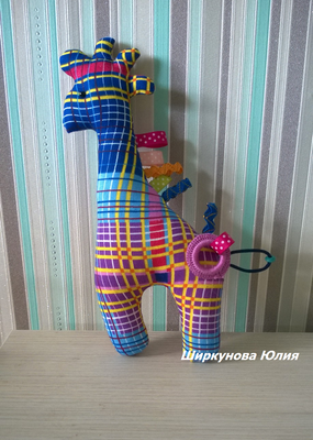 Игрушка-сплюшка Жирафик. Высота 23 см. Сшит из 100 % хлопка, тканевые ленты, бусины, кольцо-грызунок, наполнитель синтепух. Можно использовать как сплюшку, грызунок, развивающую игрушку для детей до 2 лет. Данную игрушку очень удобно держать в детских ручках. Двухцветный жирафик: Высота 25 см, плюс шуршащие лапки 5 см. В наличии голубой жирафик, разноцветный под заказ 3-5 дней.