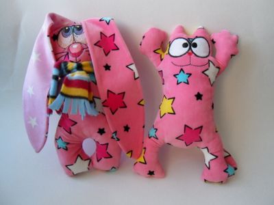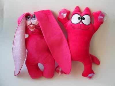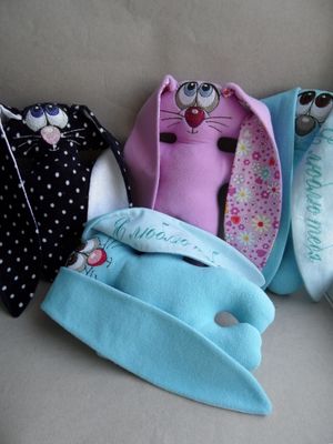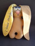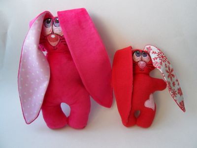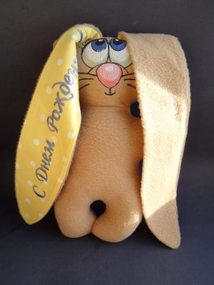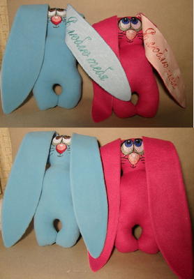 Игрушки для детей и для взрослых. Машинная вышивка. Ткань флис, велюр. Зайчики с надписью на ушке "Я люблю тебя", "С днем рождения".