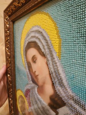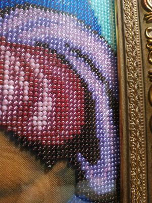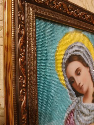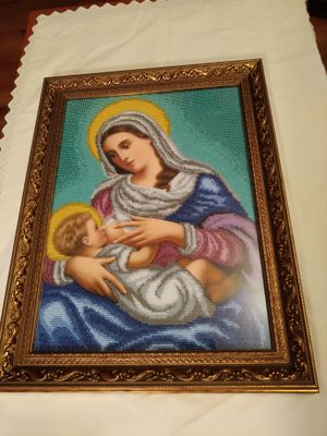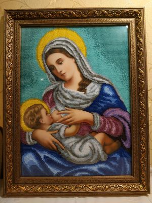Икона Божья Матерь «Млекопитательница». полная зашивка (кроме ликов, рук и ног) чешским бисером Preciosa. размеры (В*Ш, см): без багета 36*26, с багетом 45*35. Икона оформлена в багетной мастерской, под стеклом.Цвета намного ярче и глубже чем на фото. Возможен торг. ---------------------------------------------------------------- Значение образа Материнское молоко – это символ всего ценного, что дарит мать ребёнку после его рождения, а сам процесс кормления приравнивается к великому таинству. Многие, из молящихся перед этой иконой, полагают, что именно таким должно быть лик матери, не тяготящейся своим материнством, испытывающей от него радость. Тогда и само кормление будет актом полным тепла, искренней любви и заботы. В этом изображении сочетается одновременно несколько образов Девы Марии: Мать – окружающая дитя своей любовью; Кормилица – помогающая напитать младенца; Заступница – защищающая от болезней и недугов, а также от бед и напастей. Поэтому её покровительство так необходимо всем женщинам и их чадам.