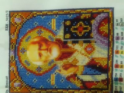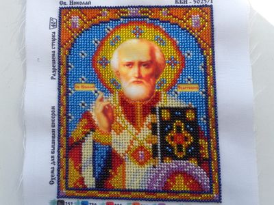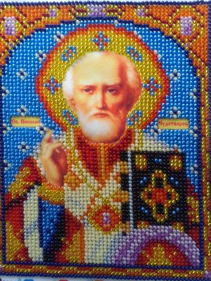 Икона "св. Николай чудотворец", вышитая бисером. Икона не обрамлена в рамку. Святитель Николай является покровителем мореплавателей, к которому часто обращаются моряки, которым угрожает потопление или кораблекрушение. В католической традиции распространена легенда о том, как святитель Николай помог трём девушкам, отец которых, не имея возможности собрать приданое, планировал извлекать доход из их красоты. Узнав об этом, Николай решил помочь девицам. Будучи скромным (или желая избавить их от унижения принятия помощи от постороннего), он тайком пробрался в их дом и оставил кошелёк с приданым для старшей дочери. То же самое для средней дочери он проделал на следующий год (по другой версии, на следующий день). Поняв, что кто-то взялся помогать его дочерям, отец решил отблагодарить благодетеля, и для этого, дождавшись дня следующего визита, спрятался в комнате дочерей. По одной версии, Николай попался, но отказался принимать благодарность, заявляя, что отец должен благодарить только Бога. По другой версии, Николай узнал о плане бедняка и бросил своё пожертвование в дымоход, где оно в конечном итоге оказалось в носке младшей дочери, сушившемся над огнём. Именно эта легенда переродилась в фольклор о Санта Клаусе и подарке в носке.[16] Ещё при жизни своей святитель Николай прославился как умиротворитель враждующих, защитник невинно осуждённых и избавитель от напрасной смерти. Рамка и паспорту по желанию заказчика договаривается отдельно. Возможно изготовление различных икон, и картин из бисера и крестом (иконы, природа, животные, цветы).