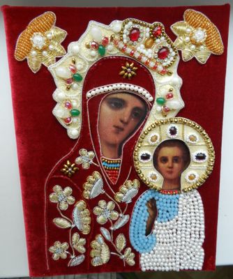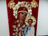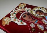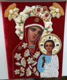 Икона писанная, рубеж 19-20века. Риза вышита на бархате с применением жемчуга, перламутра, хрустальных бусин, золотного шитья, винтажных кабошонов и страз, ручная работа. Риза натянута на икону и закреплена.Размер 18см х 24см. Отправка по РФ.