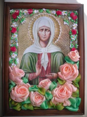 Икона Матрона Московская 21*30 вышита атласными лентами, украшена бисером. Отправлю в любой уголок мира. Чаще всего к ней обращаются с просьбами: при ущербах от стихий; во избежание обмана; помощи в сердечных делах; для сохранения семьи; при разных заболеваниях; для заботы о детях и близких; при финансовых расстройствах.