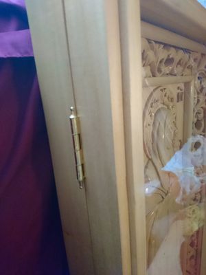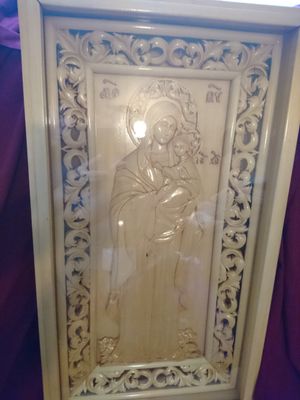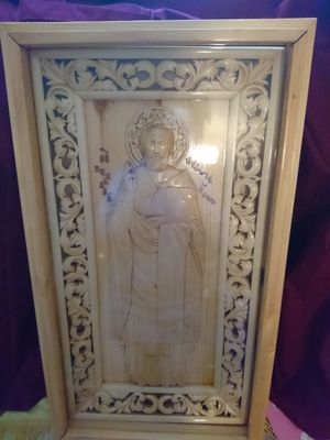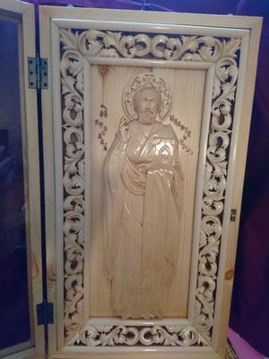 Резная икона выполнена из благородных пород дерева, покрыта 8 слоями специального лака. Имеет размеры ш 45 см х в 72 см. Необходимый уход: обработка маслом 1 раз в год при обычной влажности воздуха. Или реже.