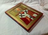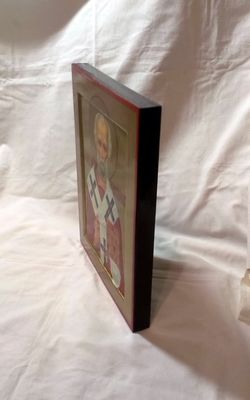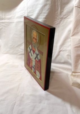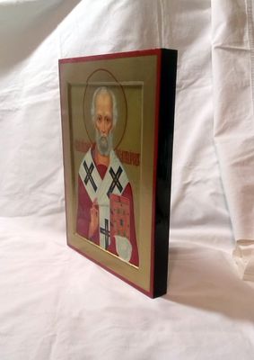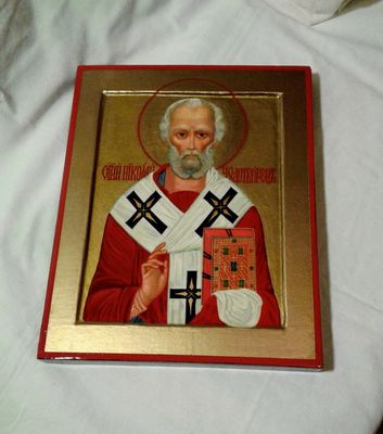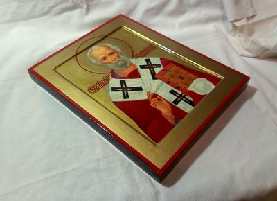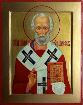 Православная рукописная икона Святой Николай Чудотворец. Икона в стилистике позднего русского модерна. Размеры: Ширина 24 см. Высота 30 см, Толщина 2,5 см. Материалы: Иконная доска с ковчегом, торцевые дубовые шпонки, левкас, поталь, темпера, масло, олифа, натуральный лак. Смешанная техника. Доставка иконы во все регионы России, согласно установленным правилам почтовых служб.