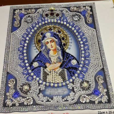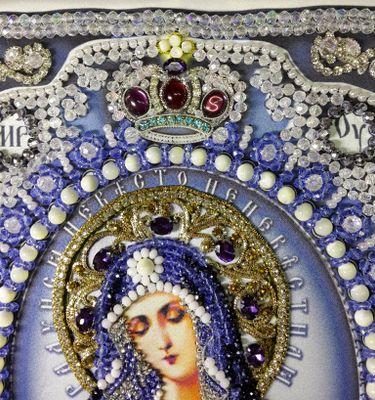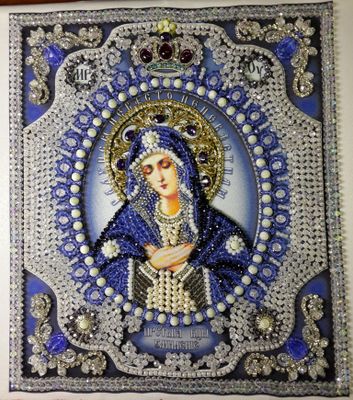 Добавлены бусины с AB покрытием для придания большего блеска, а так же жемчуг, бусины натурального перламутра, чешские кабошоны, стразы и шитье канителью. Пришивалось все по схеме с некоторыми изменениями. Блеск получился потрясающий, видео и фото его не передает конечно. Размер 22х25см. Отправлю по РФ