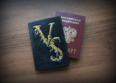 Именная обложка для паспорта из натуральной кожи растительного дубления. Полностью ручная работа: гравировка, окрашивание, обработка, сшивание седельным швом вощеными нитями. Выполняется по индивидуальному заказу, по вашим инициалам (либо другой рисунок), цветовая гамма обсуждается. Возможно использование в качестве обложки на автодокументы, вкладыш в наличии (продается отдельно). Ценно, надежно, эксклюзивно!