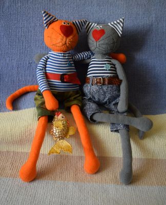 Коты-рыбаки замечательный подарок как ребёнку, так и взрослому человеку. Могут украшать интерьер, так и быть игровой куклой. Голова и туловище плотно набиты текстильным синтепоном, лапки мягкие, подвижны. Рекомендую только сухую чистку. Рост 72см. Золотая рыбка исполняет желание. При покупке пары цена 5000руб.