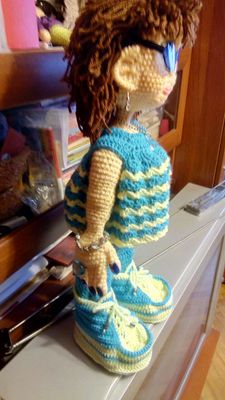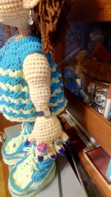 Каркасная вязанная кукла (гнутся руки,ноги,пальцы,туловище),в красивой подарочной упаковке. Дама с гламурной собачкой и аксессуарами ищут новый дом:-))). В комплекте съемные-одежда,очки,кольца,серьги,часы кепка, собака,сумка,жилетка,поводок.