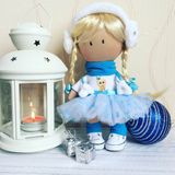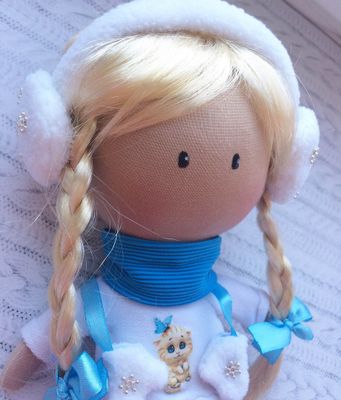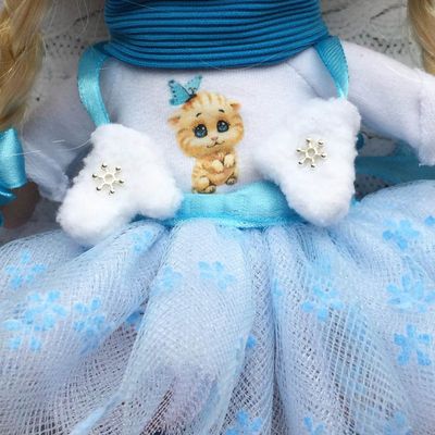 Интерьерная куколка Снежинка станет прекрасным украшением Вашего дома и будет радовать как Вас так и Ваших деток. Куколка создаст уютную атмосферу. Может стать прекрасным новогодним подарком или на любой другой праздник.Одета в свитшот с термотрансфером и юбку-пачку, Так же имеются меховые наушники , варежки и шарфик с гетрами.Обута в модные кеды на шнурках. Одежда не снимается, так как куколка интерьерная, стоит самостоятельно.