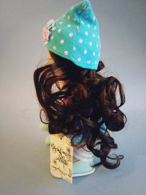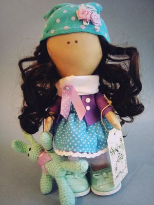 Продается интерьерная куколка ручной работы. Выполнена с любовью. Будет прекрасным другом девчуле любого возраста. Зайка вязанный прекрасно дополняет куколку.Будет отличным подарком на любой праздник. Из одежки снимаются только башмачки. Изготовлю куклу на заказ по вашим пожеланиям.