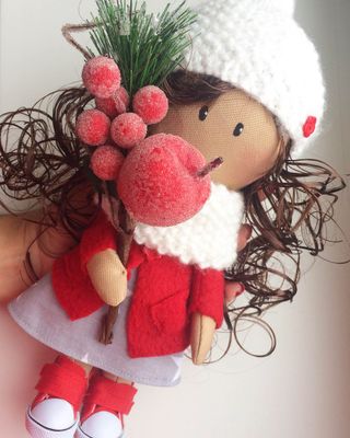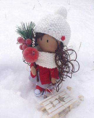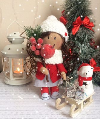 Новогодняя интерьерная малышка с санками станет прекрасным украшением Вашего дома и будет радовать как Вас так и Ваших деток. Куколка создаст уютную новогоднюю атмосферу. Одета в платьице, пальтишко, вязаную шапочку и снуд. Одежда не снимается, так как куколка интерьерная. Стоит самостоятельно.