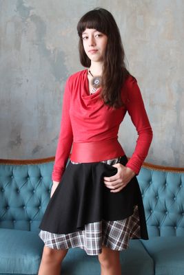 карманы , двуслойная юбка и кокетка из кожи