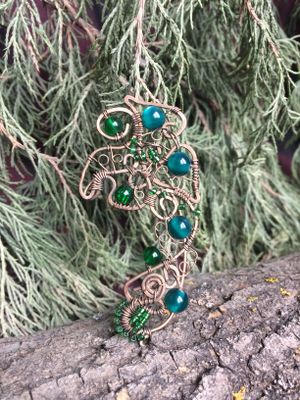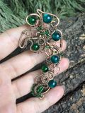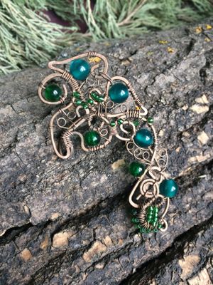 Ажурный кафф "Малахитовая ящерка" на левое ушко. Он словно был найден в сокровищах хозяйки медной горы...Бусины-кракле искрятся на солнце, а "кошачий глаз" мягко переливается, как капли росы на листьях деревьев в неровной лунном свете...