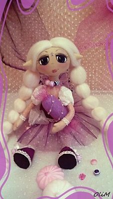 Рост 33см. Стоит и сидит сама, ручки, ножки и голова подвижны. Одежда и обувь не снимается. Материалы: хлопок, хлопковое кружево, фетр, фатин с напылением, бисер, стеклянные бусины, стразы, нейлоновая лента. Волосы - шерсть 100%.
