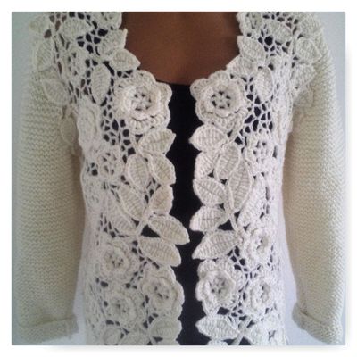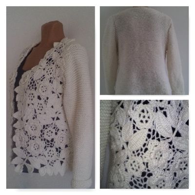 Кардиган выполнен в технике ирландское кружево, рукава и спинка связаны на спицах