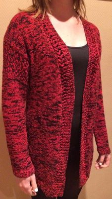 Кардиган женский вязаный на 46-48 размер, хлопок/крючок, двухцветная декоративная нить, на рукавах и вдоль резинки по полочкам рисунок сеточка.. ручная работа
