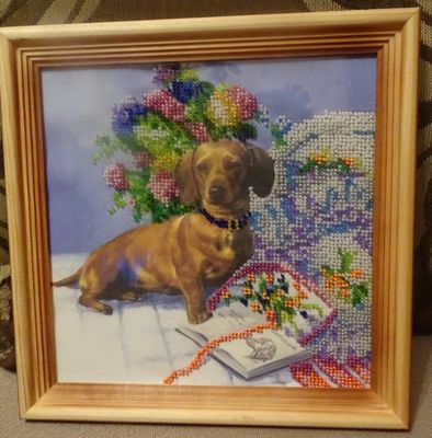 Картина вышитая бисером,продается вместе с багетом.Будет хорошим подарком и принесет удачу в новом году Собаки!Размер -20*20