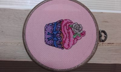 Нежная картина из серии "Сладкая вышивка". Украсит любой интерьер. Материалы: Канва Аида 14 розовая, нитки мулине, пяльцы-рамка круглые, под дерево